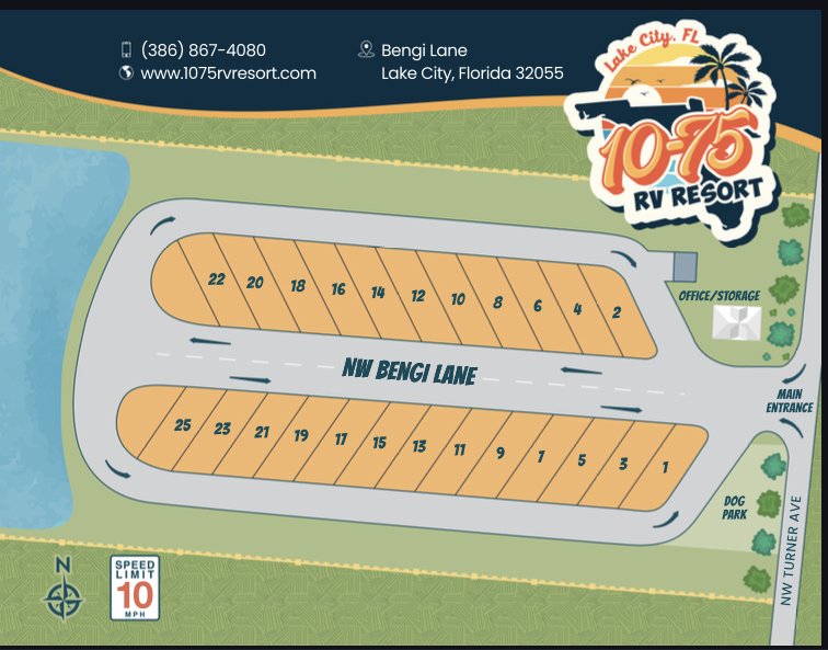 1075 RV Resort is a premier RV destination located in Lake City, Florida, at the intersection of I-75 and I-10. Opened in 2023, the resort is designed specifically for RVs, motorhomes, and travel trailers; tent camping is not permitted.