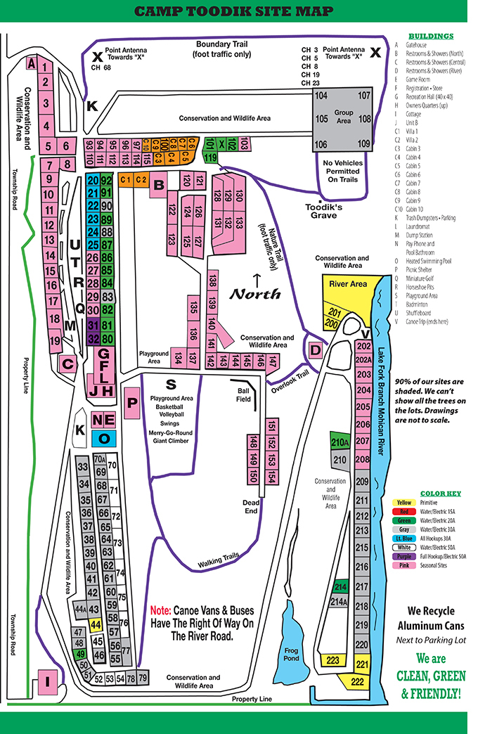 Camp Toodik is a 93-acre park located near Loudonville, Ohio. It features 223 full or partial hookup campsites that are big rig friendly for RVs of up to 45 feet. Many of them accommodate slide out RVs. The park provides free WiFi, allows pets, and has a dump station.