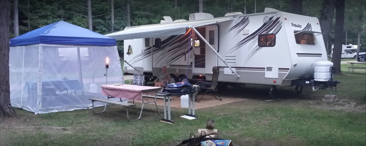 Campsite amenities offered include access to ATV trails, a seasonal pool, a pavilion, picnic tables, fire circles, and grills. It also includes basic amenities like restrooms with hot showers and laundry facilities. Visitors can also enjoy activities such as DJ-hosted weekend dances, hiking, biking, fishing, kayaking, and canoeing.