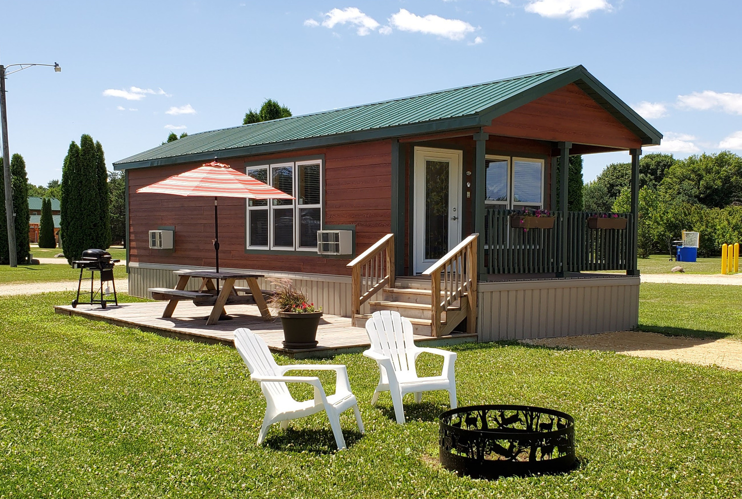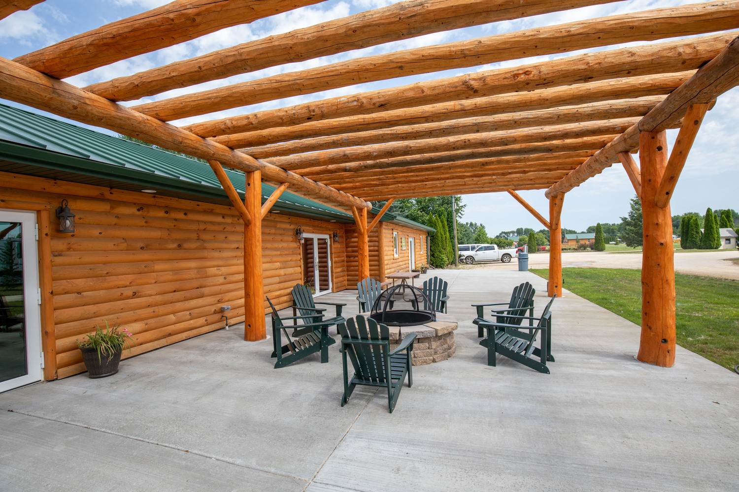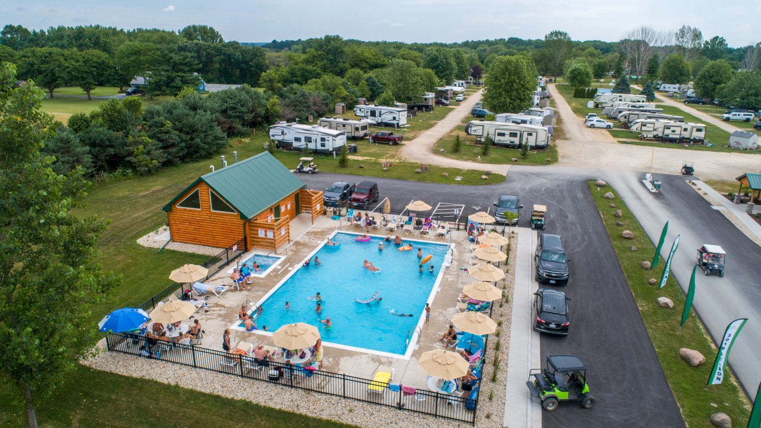Take a break from the hustle and bustle of city and suburban life and enjoy a RV camping trip on the river in Garden Prairie, Illinois. Northwoods RV Resort is less than 90 minutes from Chicago. Our gated RV resort campground features a brand new swimming pool and hot tub, new bathhouses, community lodge, log pergola patio with fireplace, swimming beach, full hookups for water, power & sewer, laundry facilities , restrooms, snack bar, on-site propane filling, new WiFi infrastructure and tons of planned activities. Our pristine 60 acre park is spacious and comfortable and located right on the Kishwaukee River. If you are searching for a quiet and peaceful campground setting for your vacation, then book your stay at Northwoods RV Resort today. Break out the hot dogs and marshmallows to by the fire with your family. Come rough it in style!