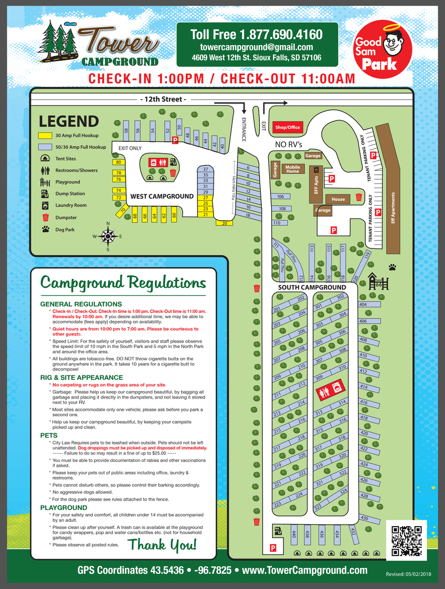 This campground, located on 4609 West 12th Street in Sioux Falls, SD, is the ONLY campground in Sioux Falls open ALL YEAR ROUND! With easy on and off access from Interstate 29, Tower campground has daily, weekly and monthly rates available. Good Sam, Retired Military and Military discounts available. Amenities include large shade trees, Dog Park, Playground, Secure Restrooms and Showers, Secure On-Site Laundry, Vending Machines, Free Wireless High-Speed Internet, Free HD Cable TV, items such as Ice, Wood, Propane and Snacks for sale. Tower Campground is located in the most convenient location as they are just minutes from restaurants, shopping malls, hospitals, golf courses, zoo, bike trails, sporting arenas, science museum, Falls Park, Historic Downtown Sioux Falls and so much more!